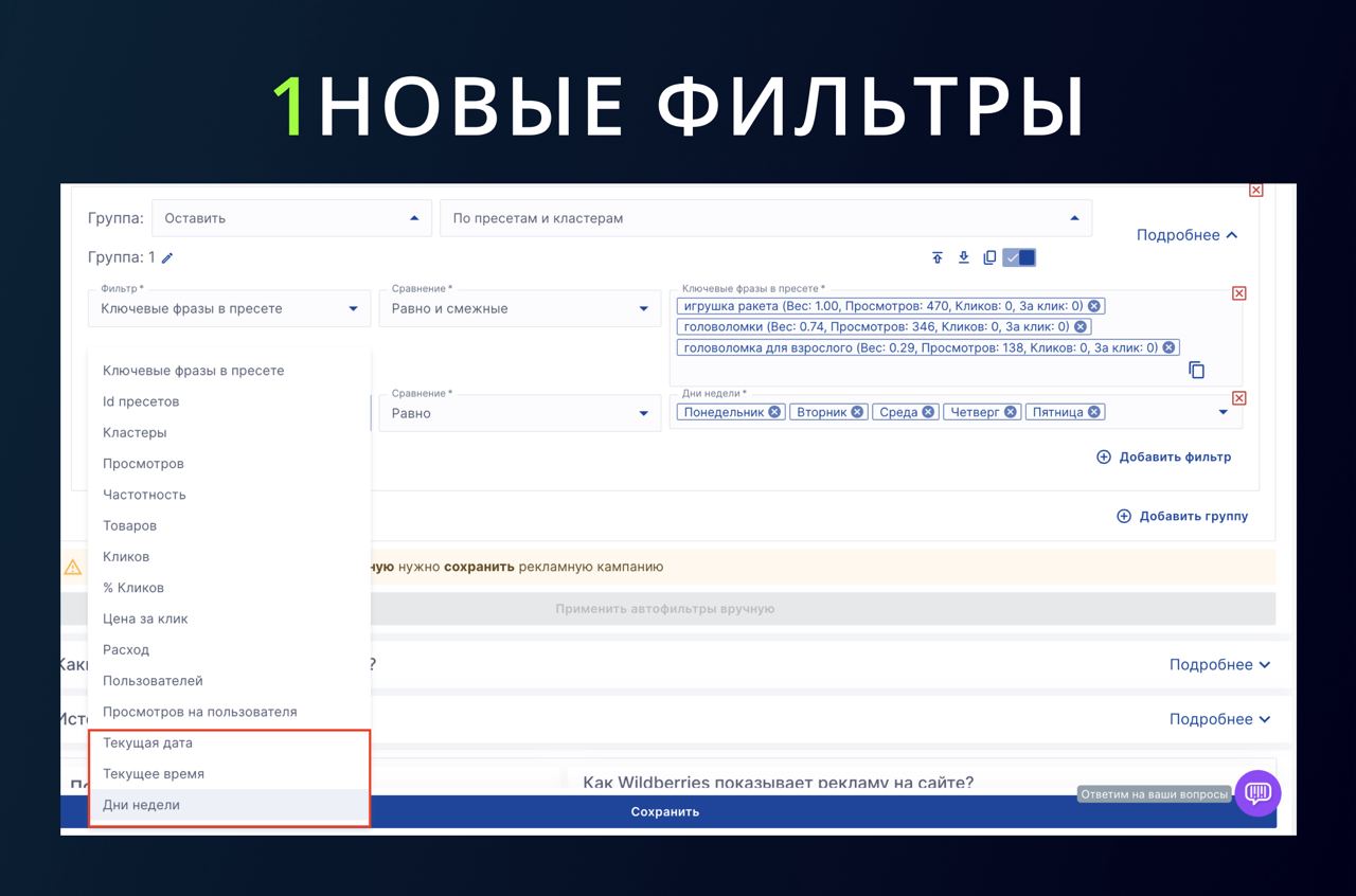 НАПРИМЕР: ✅ В пн,вт,ср,чт,пт показы идут по ключам из первой группы, а в выходные по ключам из второй группы ✅ Или до 25 числа реклама показывается по выбранным ключам или фильтрам, а после 25 числа настройки меняются автоматически ✅ Или утром реклама идет по одним ключам, а вечером уже по новым