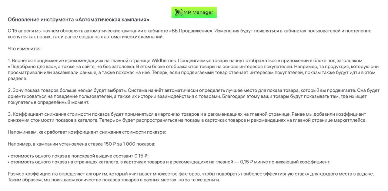 **С 15 апреля в кабинете «ВБ.Продвижение» **начнется обновление Автоматических кампаний, они будут появляться постепенно в кабинетах пользователей. Все нововведения коснутся как новых, так и ранее созданных автоматических кампаний.