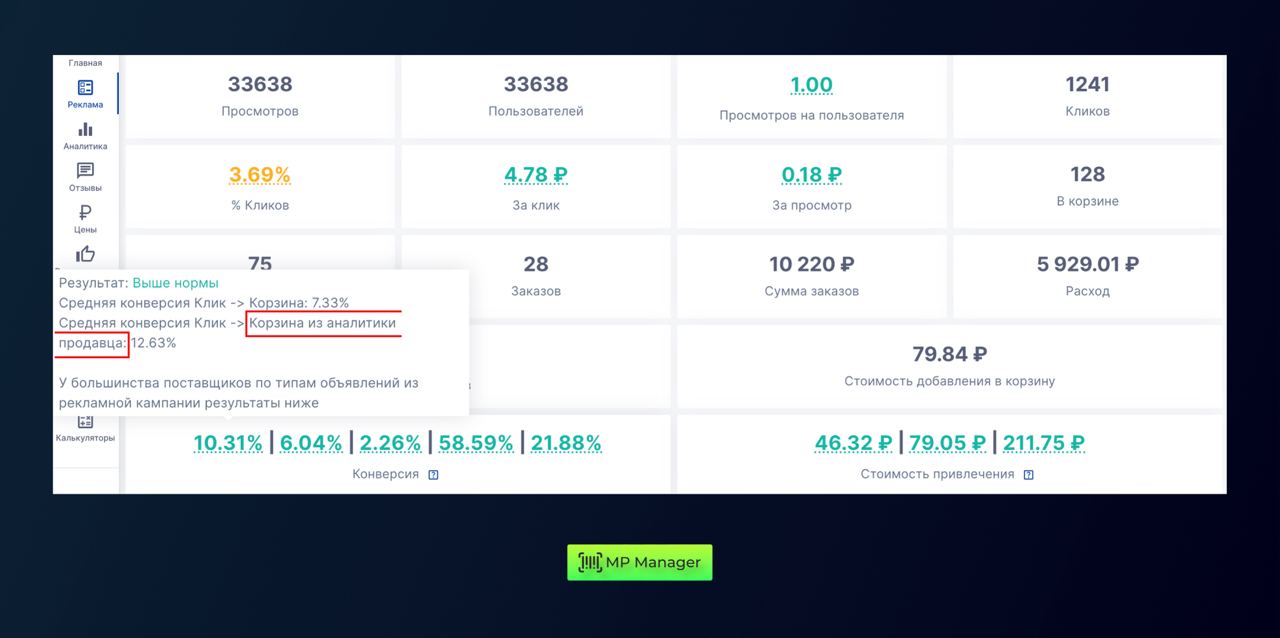 Теперь при наведении на данные по конверсиям отображаются не только данные среди рекламных кампаний с таким же предметом, но и **данные из аналитики продавца **✔️