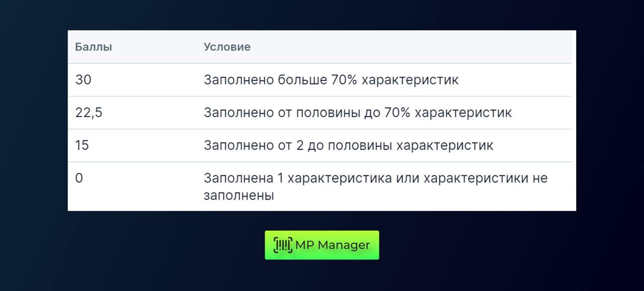 ** Например:** ✔️ Если продавец укажет только одну из девяти возможных характеристик, то оценка будет нулевой ✔️ Если он заполнит от двух до четырех характеристик, карточка получит 15 баллов ✔️ При указании семи и более характеристик — 30 баллов.