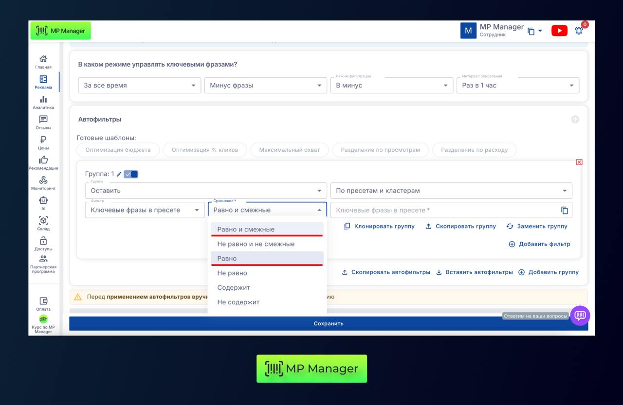 В блоке Автофильтры в группе Оставить можно выбрать, как сравнивать ключевые фразы в пресете.