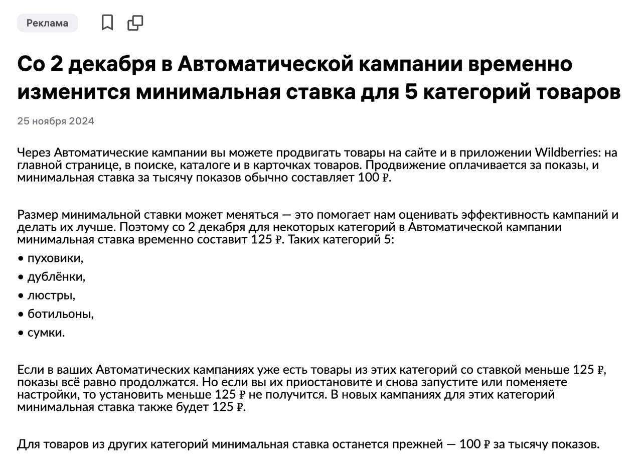 - Сумки ** Маркетплейс сообщает, что изменения могут быть временными ** ВАЖНО: ✔️ Если в ваших текущих кампаниях уже есть товары из этих категорий со ставкой ниже 125 ₽, показы продолжатся. ✔️ Приостановив кампанию или изменив настройки, установить ставку ниже 125 ₽ будет невозможно. ✔️ В новых кампаниях минимальная ставка для этих категорий также составит 125 ₽.