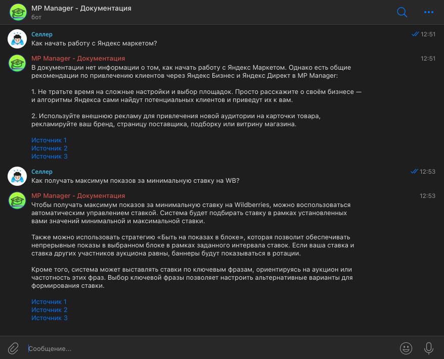 Мы постоянно дорабатываем документацию и добавляем новые источники. Если у вас есть что-то полезное, напишите нам в @mpmgr_support_bot, и мы добавим это в базу знаний! ** 🚀Попробуйте бот уже сегодня: **@mpmgr_docs_bot