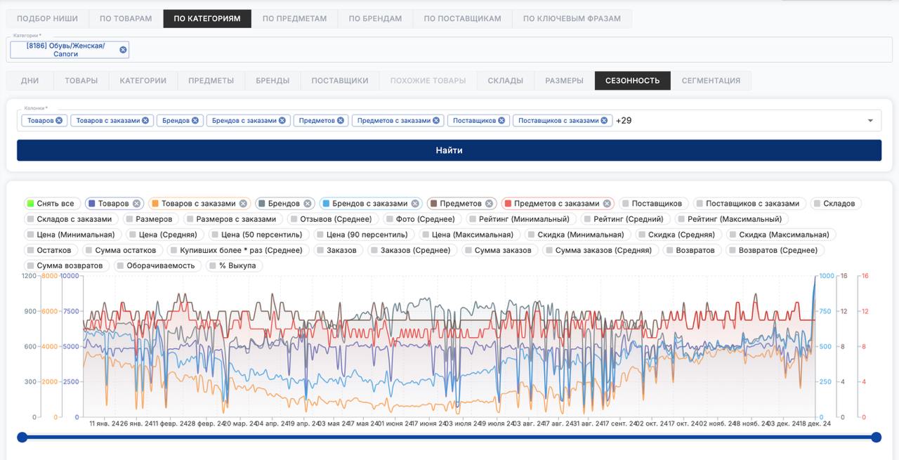 📊 Смотреть сезонные изменения на графиках и в таблицах, сезонность можно смотреть по категориям, предметам, поставщикам, брендам и тд