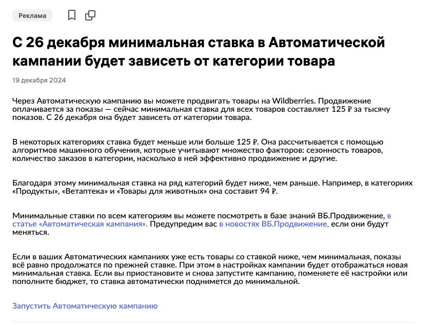 С 26 декабря на Wildberries изменения во всех минимальных ставках для АРК! 📣