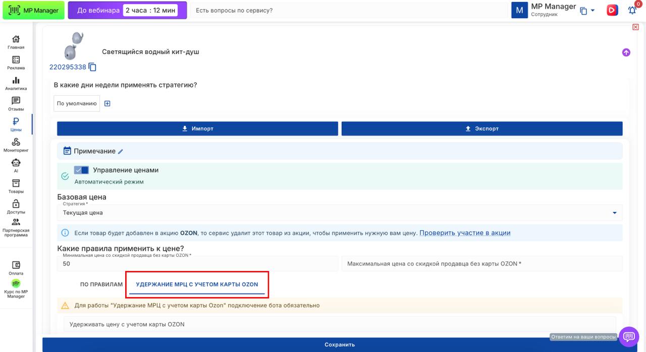 Отличная новость для всех продавцов! Теперь MP Manager снова отслеживает цены с учетом карты OZON и автоматически корректирует их, чтобы ваша цена на OZON не оказалась ниже, чем на других маркетплейсах.