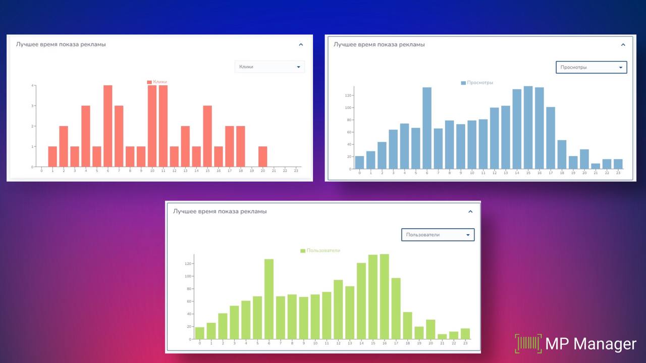 β Π’Π΅ΠΏΠ΅ΡΡ Π΄Π»Ρ ΠΊΠ°ΠΆΠ΄ΠΎΠΉ ΡΠ΅ΠΊΠ»Π°ΠΌΠ½ΠΎΠΉ ΠΊΠ°ΠΌΠΏΠ°Π½ΠΈΠΈ Π² MP Manager ΠΏΠΎΡΠ²ΠΈΠ»ΠΈΡΡ Π³ΡΠ°ΡΠΈΠΊΠΈ **Π»ΡΡΡΠ΅Π³ΠΎ Π²ΡΠ΅ΠΌΠ΅Π½ΠΈ ΠΏΠΎΠΊΠ°Π·Π° ΡΠ΅ΠΊΠ»Π°ΠΌΡ ** π ΠΠΎ Π³ΡΠ°ΡΠΈΠΊΠ°ΠΌ ΠΌΠΎΠΆΠ½ΠΎ ΠΎΠΏΡΠ΅Π΄Π΅Π»ΠΈΡΡ Π²ΡΠ΅ΠΌΡ, ΠΊΠΎΠ³Π΄Π° ΠΏΡΠΎΡΠΌΠΎΡΡΠΎΠ² ΠΌΠ½ΠΎΠ³ΠΎ, Π° ΠΊΠ»ΠΈΠΊΠΎΠ² Π½Π΅Ρ, ΠΈ ΠΎΠ³ΡΠ°Π½ΠΈΡΠΈΡΡ ΠΏΠΎΠΊΠ°Π·Ρ Π² ΡΡΠΈ ΡΠ°ΡΡ