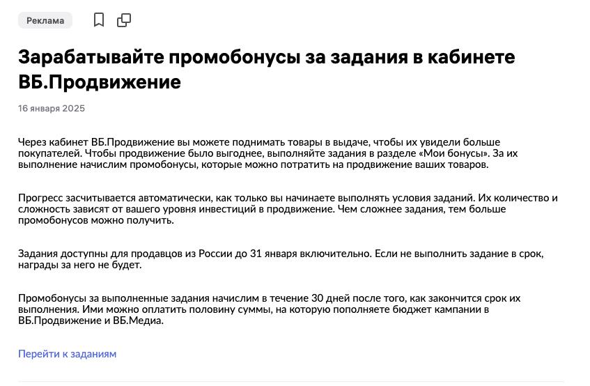 Получайте промобонусы за выполнение заданий в кабинете ВБ.Продвижение! 🚀