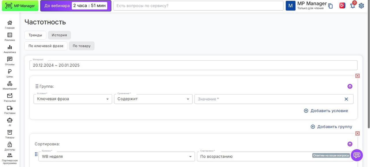 🚀 **Что нового? ** Мы переработали раздел «Мониторинг» для повышения удобства работы с данными. Ранее вкладки «Тренды частотности» и «История частотности» находились отдельно, что усложняло доступ к информации. Теперь они объединены во вкладку «Частотность», где собраны все необходимые данные для анализа в одном месте.