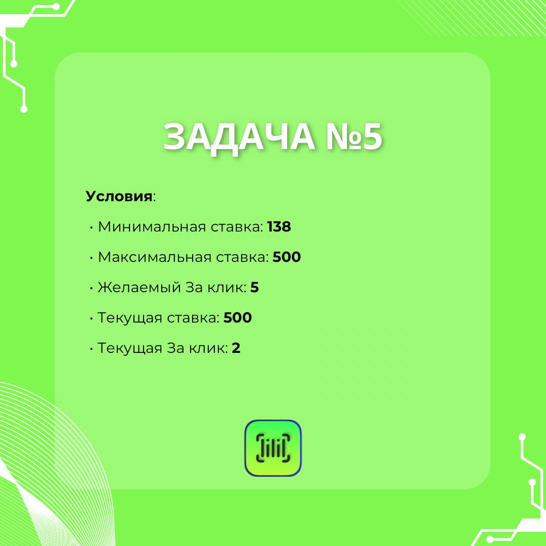Условия: • Минимальная ставка: 138 • Максимальная ставка: 500 • Желаемая цена за клик: 5 ₽ • Текущая ставка: 500 • Текущая цена за клик: 2 ₽