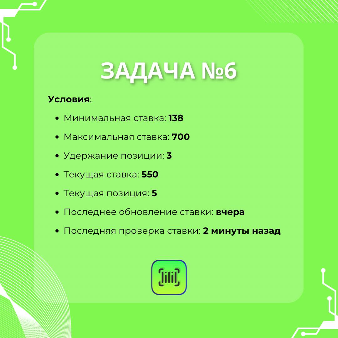 Условия: • Минимальная ставка: 138 • Максимальная ставка: 700 • Удержание позиции: 3 • Текущая ставка: 550 • Текущая позиция: 5 • Последнее обновление ставки: вчера • Последняя проверка ставки: 2 минуты назад