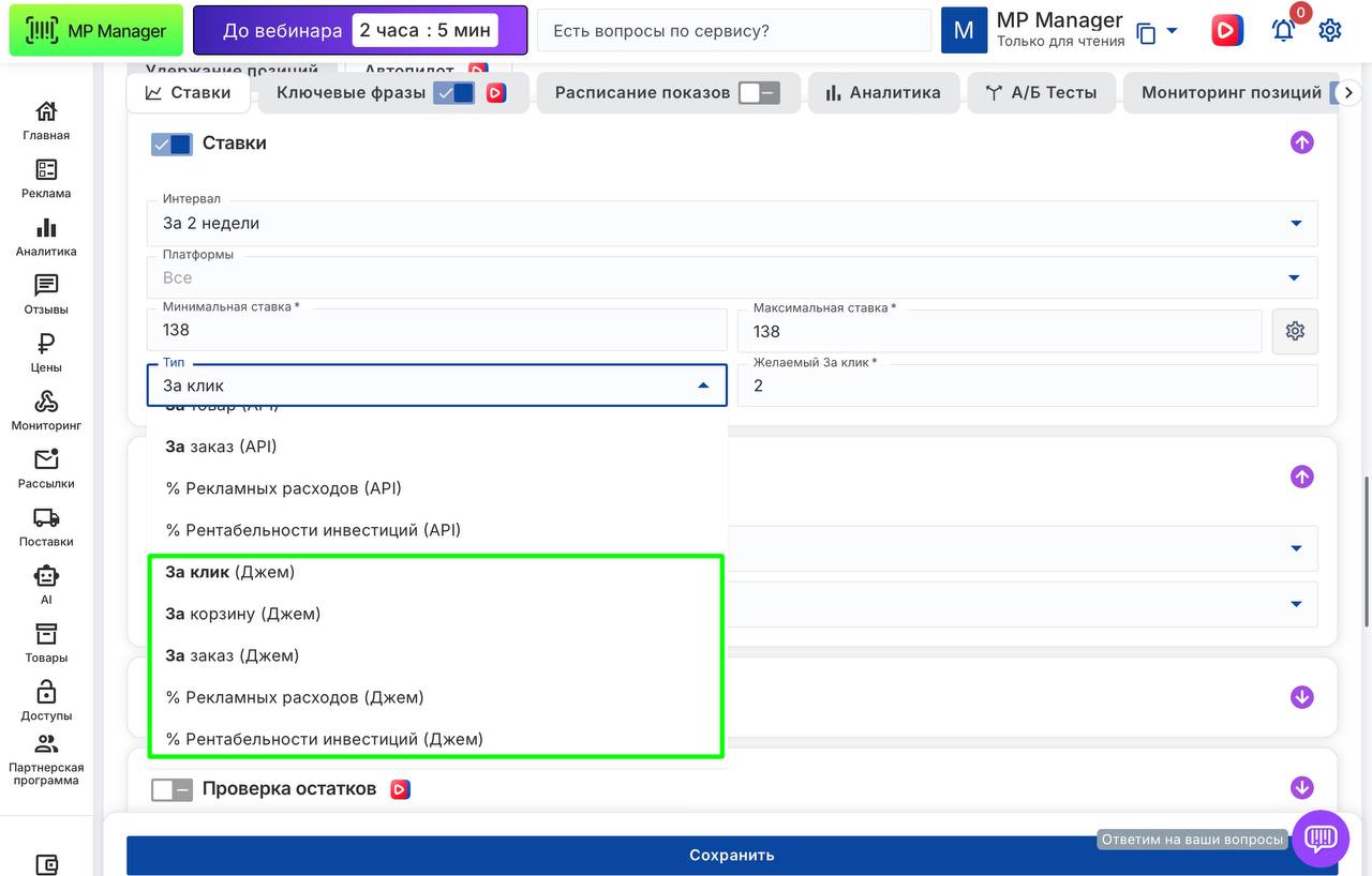 Что это значит для вас? Теперь вы можете настроить управление ставками с учетом дополнительных стратегий: ✔️За клик (Джем) ✔️За заказ (Джем) ✔️За корзину (Джем) ✔️% Рекламных расходов (Джем) ✔️% Рентабельности инвестиций (Джем)