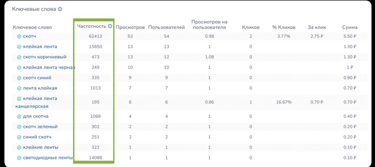 1️⃣ В рекламных кампаниях типа Поиск появилась колонка Частотность с показами за месяц на ВБ