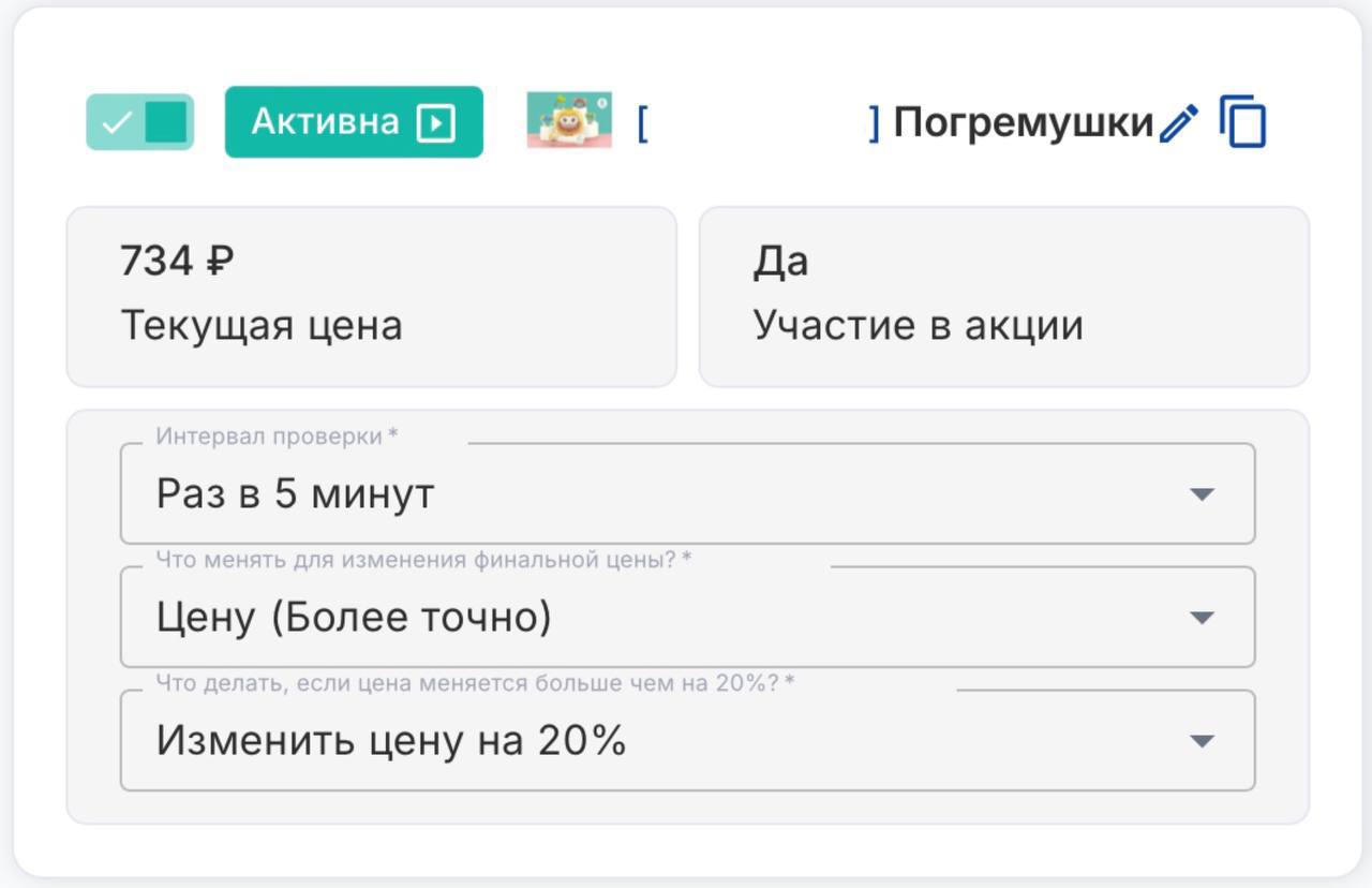 Что это даёт: ✔️ Вы сами определяете, как часто система проверяет цены конкурентов: каждые 5 минут, 15 минут, 1 час и т.д. ✔️ Тонкая настройка для каждого товара в зависимости от уровня конкуренции или стратегии ✔️ Быстрая реакция на изменения на маркетплейсах, особенно в период акций или нестабильного спроса