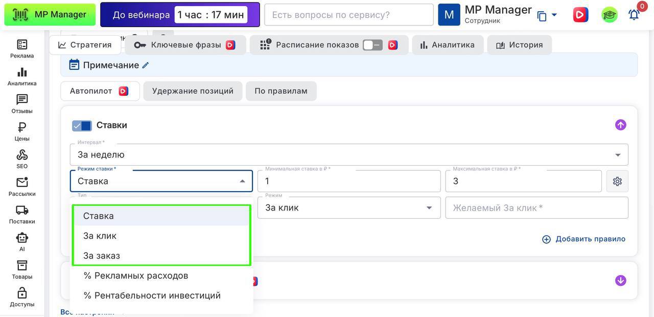 Хорошие новости — в MP Manager появилась возможность управлять ставками на Ozon не только по фиксированной сумме, но и по ключевым метрикам воронки: