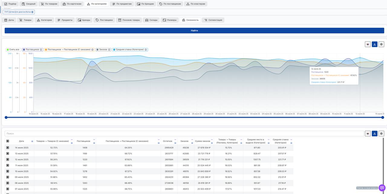 ⚠️ А вот признаки высокой конкуренции: • Количество поставщиков резко растёт • Средняя ставка в категории повышается • Процент поставщиков с заказами снижается