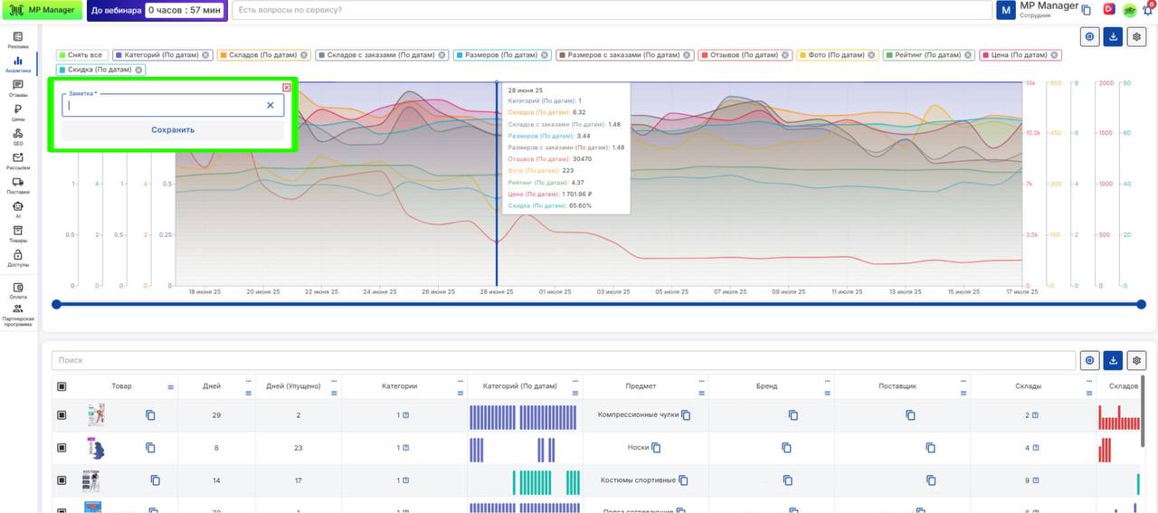 Теперь на всех графиках MP Manager можно оставлять заметки — чтобы фиксировать важные события, идеи, выводы или гипотезы прямо в точке изменения данных.