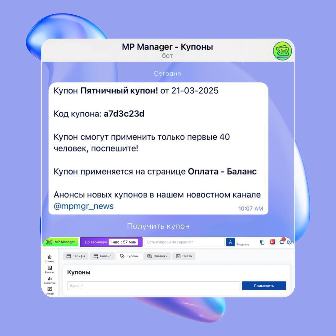 Как работает: — Купон добавит +250₽ к вашему балансу в MP Manager — Без оплат, подписок или условий — просто подарок! — Успеют только первые 40 человек, дальше — всё
