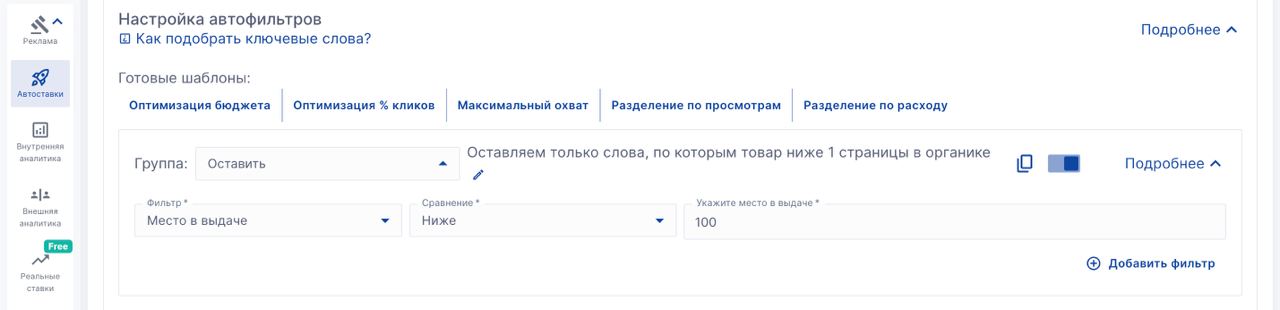 ⬇️Как быть? Используйте фильтр «Место в выдаче», чтобы не переплачивать за ключи по которым вы уже в топе органически!