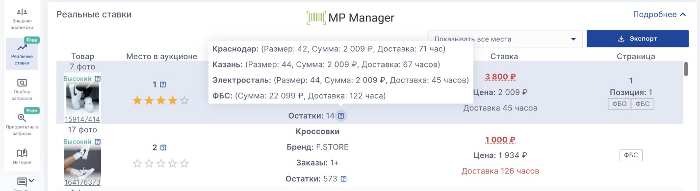 Теперь в реальных ставках можно посмотреть время доставки с каждого склада, на котором у карточки **есть остатки **