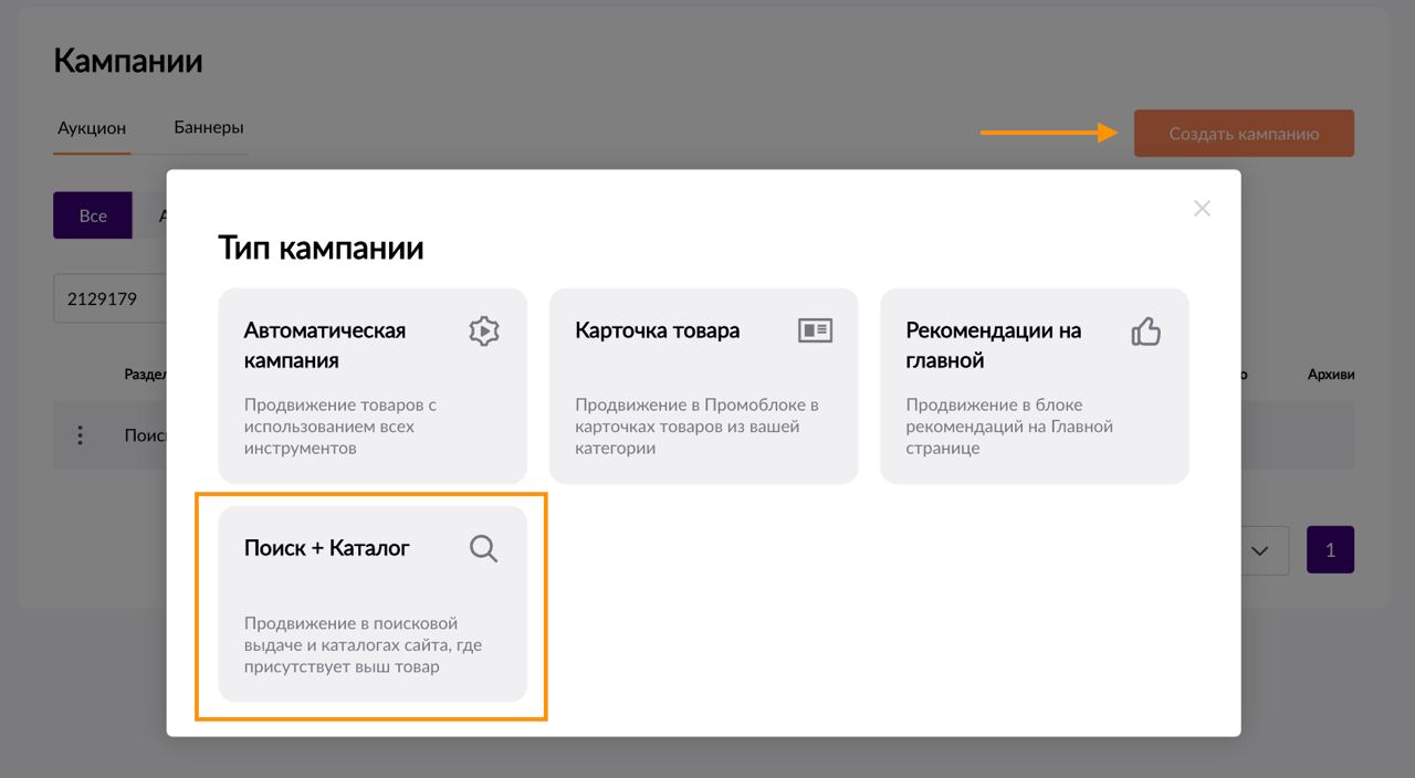 Если же **нажимать кнопку «Создать кампанию» на странице списка кампаний, то создать отдельные кампании не получится
