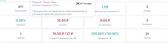 MP Manager знает** средние показатели **для кампаний с таким же предметом и показывает цветом выше или ниже средних показатели в вашей кампании