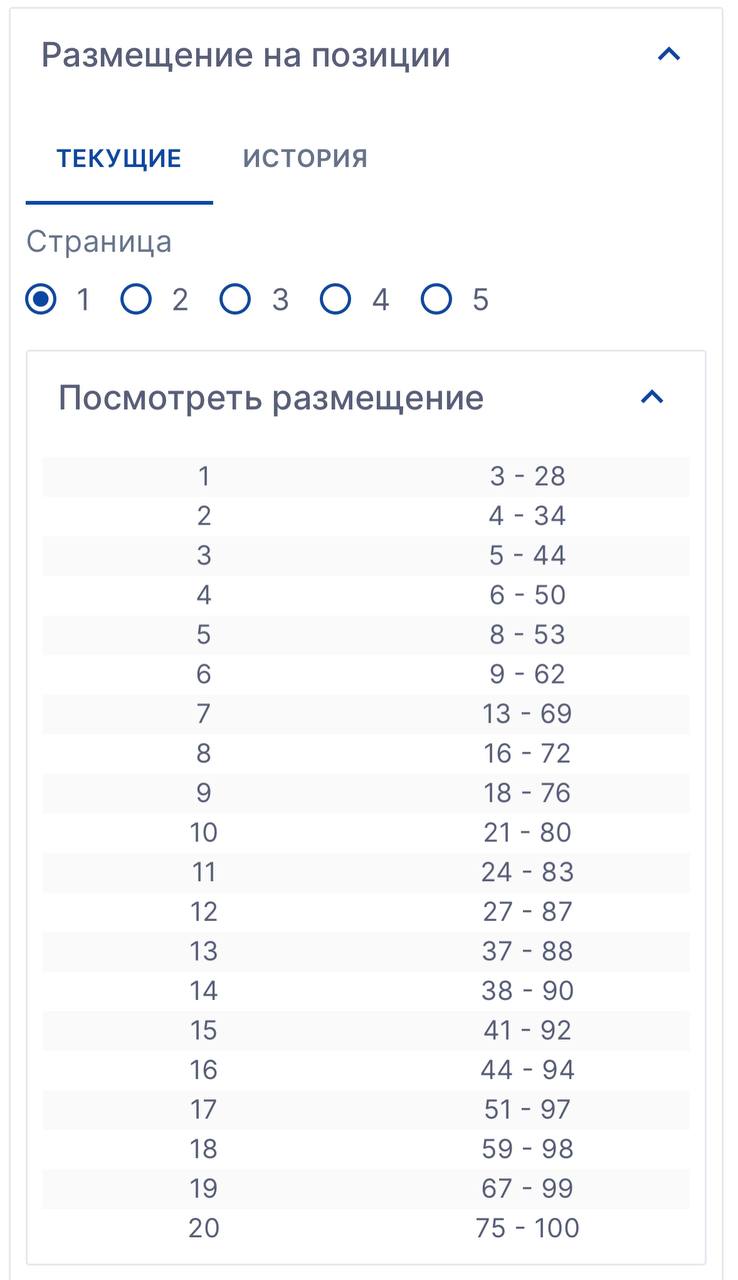 - Распределение на позициях в выдаче по месту в аукционе