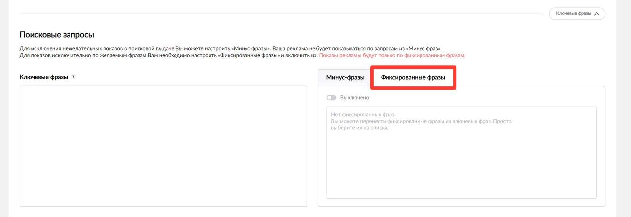Слова в раздел можно перенести из ключевых фраз и **реклама будет показываться только по ним