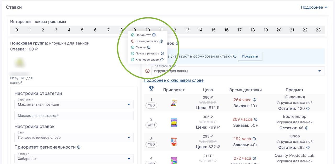Время доставки - попадает ли ваша карточка в лимит времени доставки. (По умолчанию проверяется регион Москва, если в стратегии выбран приоритетный регион, проверяться будет время доставки именно в нем)