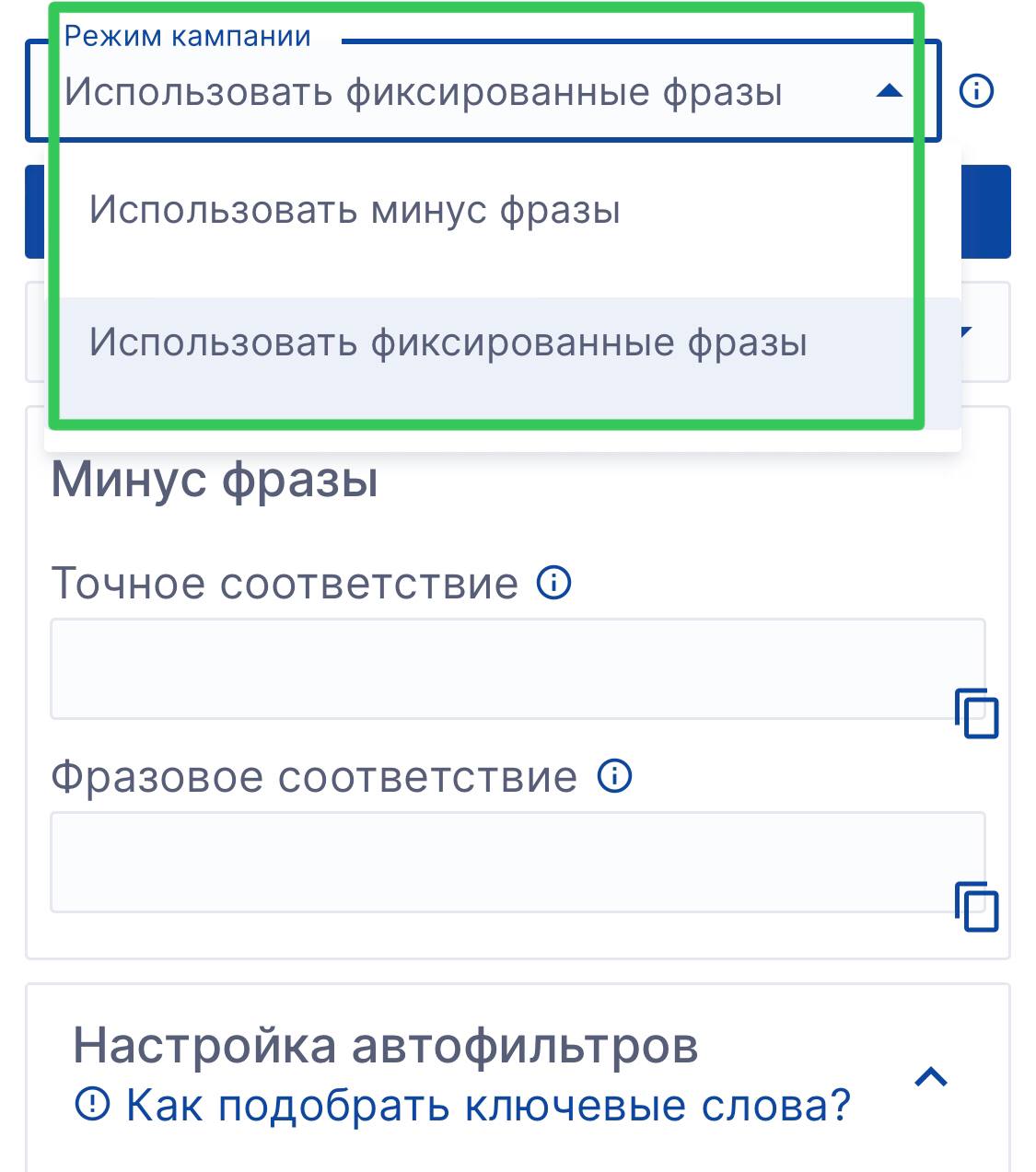 ✔️**MP Manager уже умеет работать с новым режимом «фиксированные фразы» ** В фильтрах ключевых слов появился выбор режима кампании