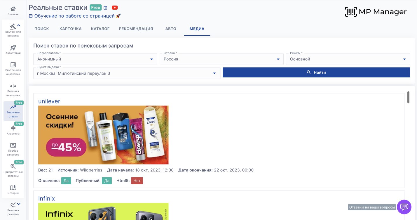 В MP Manager можно посмотреть выдачу ВБ медиа на странице Реальные ставки ПОЛНОСТЬЮ БЕСПЛАТНО✔️