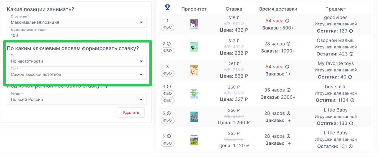 📊 Если выбрать «Самые высокочастотные» - сервис будет выставлять ставку по ключевому слову с самым большим количеством просмотров на ВБ за месяц