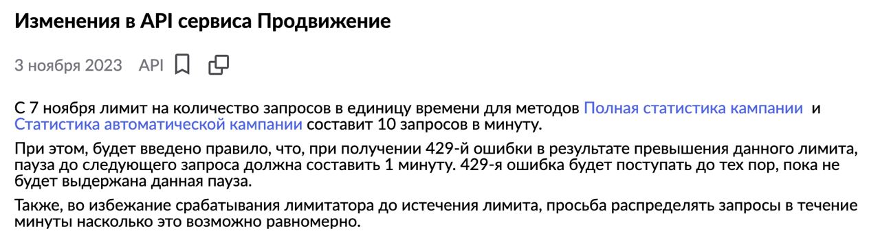 С 7 ноября ВБ ИЗМЕНИТСЯ ЛИМИТ на количество запросов в единицу времени для методов **Полная статистика кампании и Статистика автоматической кампании **составит 10 запросов в минуту!