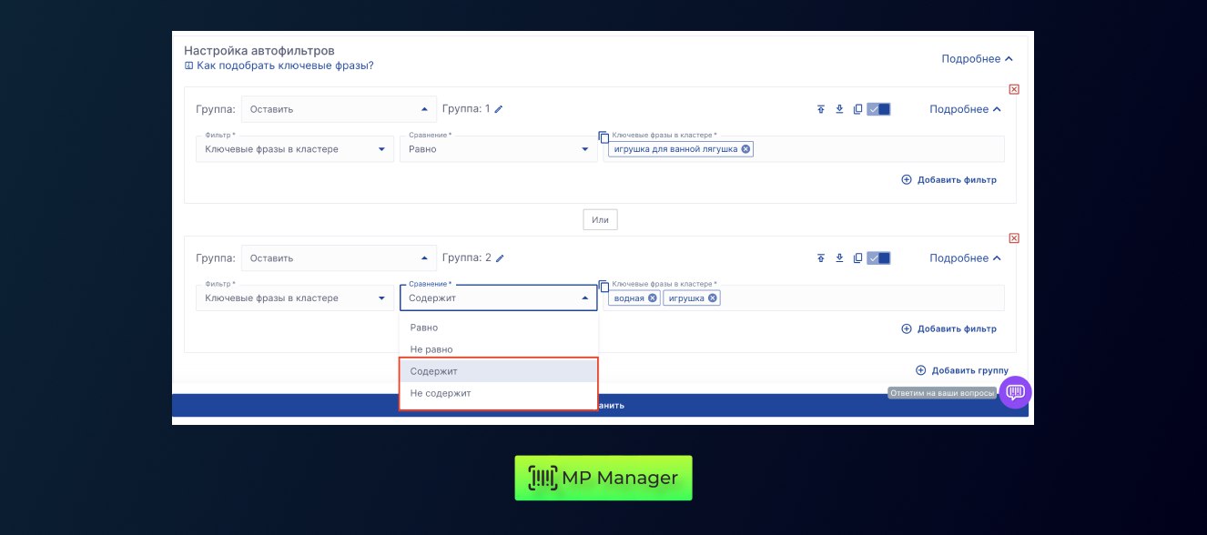**✔️ С фильтром «содержит» **стабильнее будет работать вариант «оставить». **Рекомендуем использовать такое сочетание с фильтром: