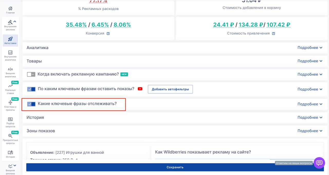 - Внутри рекламной кампании откройте блок** "Какие ключевые фразы отслеживать?"**