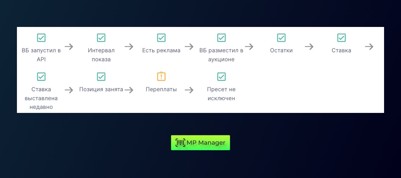 Именно поэтому в MP Manager есть специальный блок проверок для каждой кампании, чтобы вы могли знать, видеть и понимать все ли в порядке с вашей рекламой: