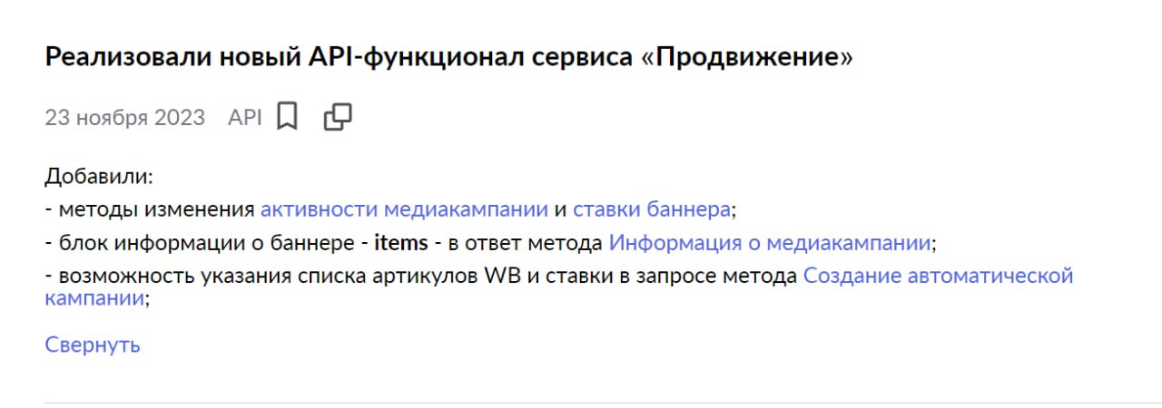 - Возможность указания списка артикулов WB и ставки в запросе метода Создание автоматической