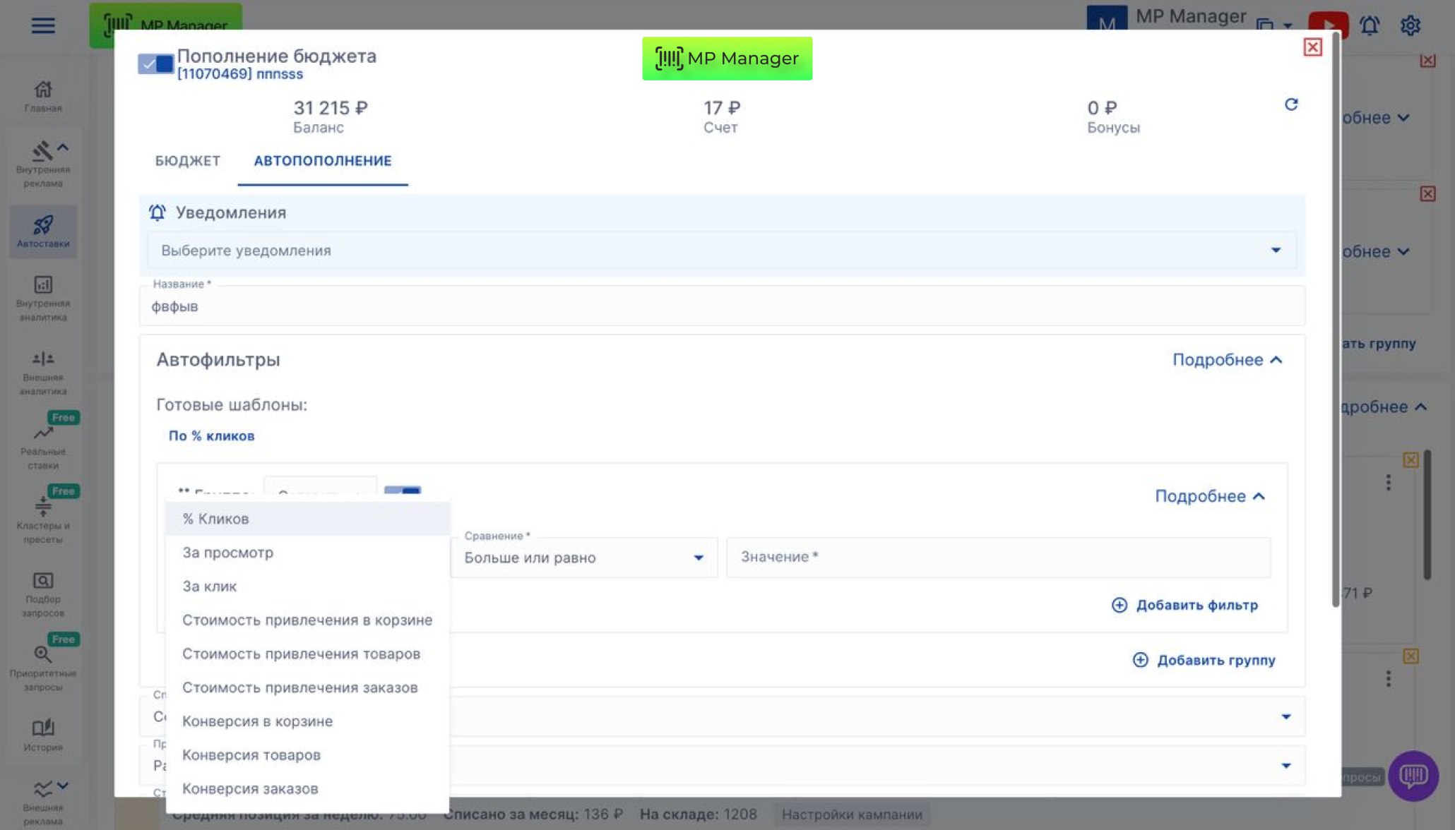 Например: Пополнять бюджет кампании, только если %Кликов больше 10 *Показатели сервис берет общие по кампании *
