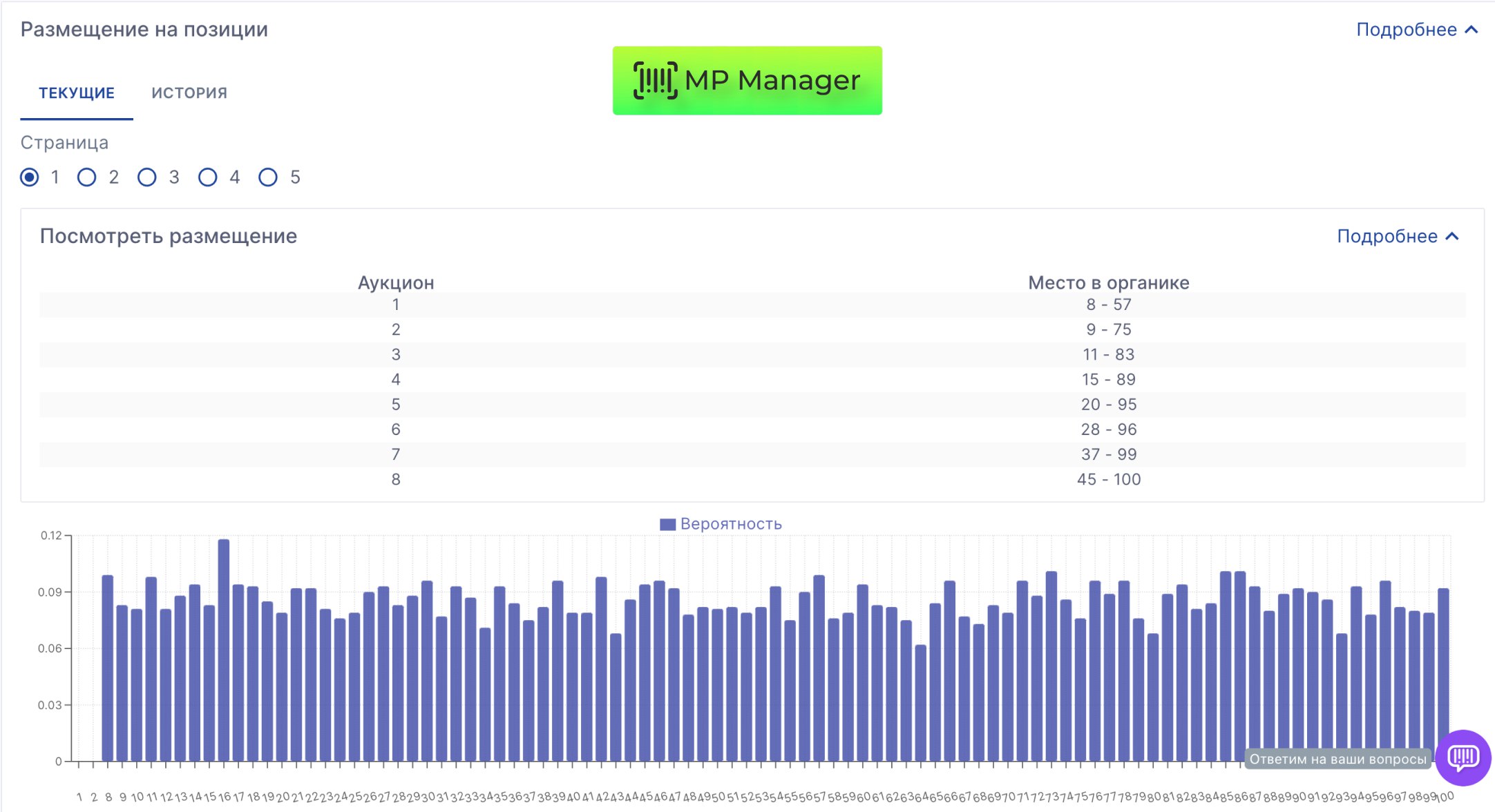 **Как сейчас распределяются места для рекламы поиск на странице?📣 ** В MP Manager вы можете посмотреть не только актуальное количество мест на странице, но и **историю изменений и вероятность попадания на конкретные позиции **