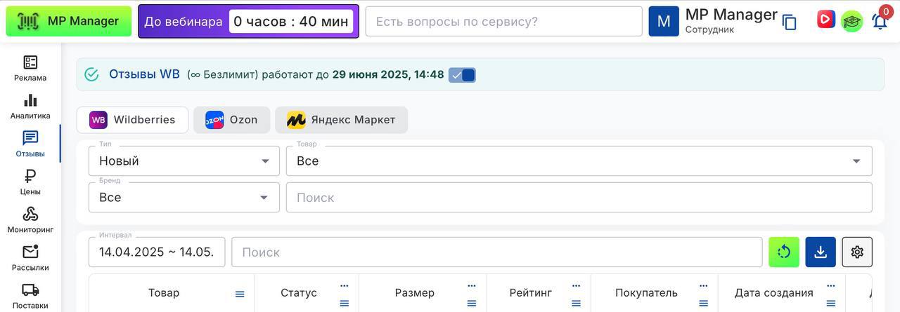 Теперь в разделе Отзывы MP Manager можно самостоятельно выбрать период, за который хотите посмотреть отзывы — просто задайте нужный интервал в календаре!