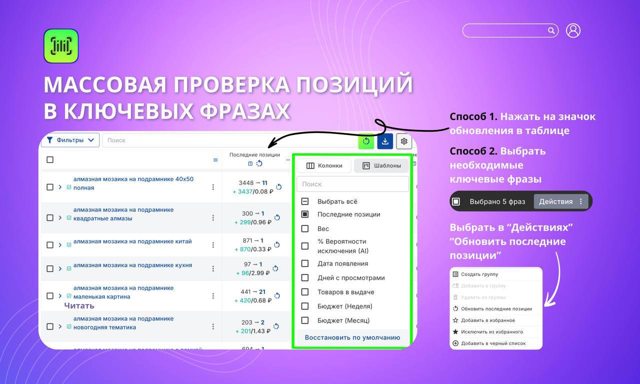 Это экономит время: не нужно переходить в другие разделы, всё — прямо внутри таблицы. Отметили нужные ключи, нажали — и через пару секунд у вас свежие данные по позициям.