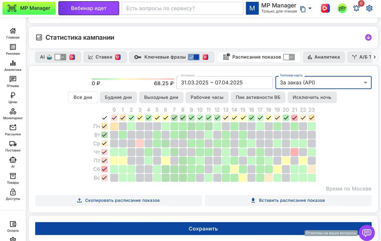 Раньше можно было анализировать только Органику и Рекламу, теперь добавлены графики и таблицы для Авто и Аукциона. Это помогает глубже понимать, какие механизмы влияют на продажи.