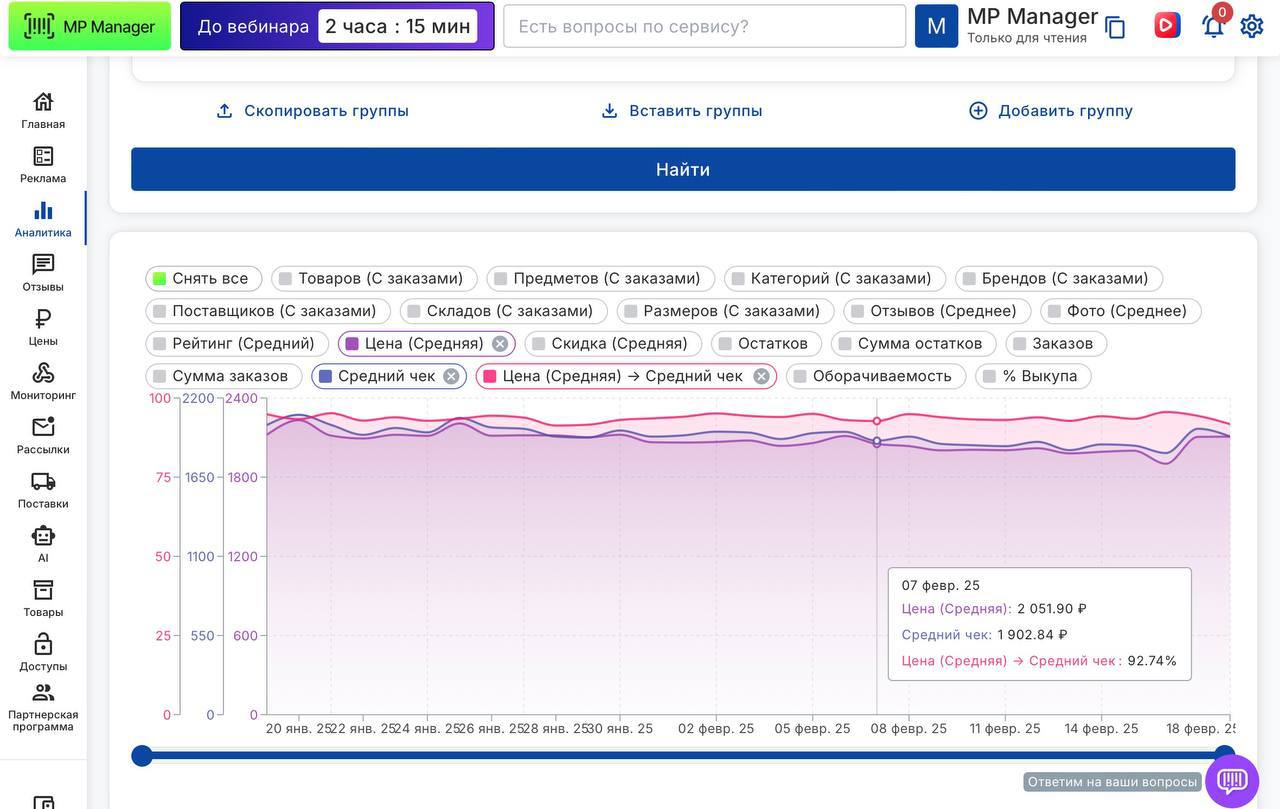 Кроме того, теперь в Аналитике появилась конверсия из цены в средний чек. Она показывает, какую часть от средней цены составляет средний чек.