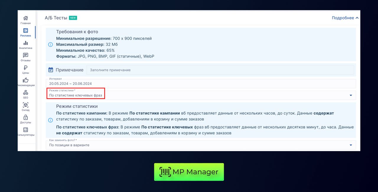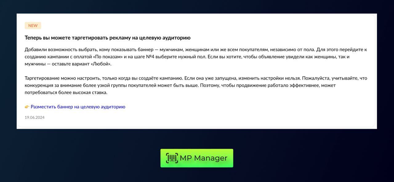 Изменения также доступны не всем из-за первоначального тестирования данной функции НА ВБ (MP Manager на это никак не влияет), но скоро она распространится абсолютно на всех продавцов, *ждем! *