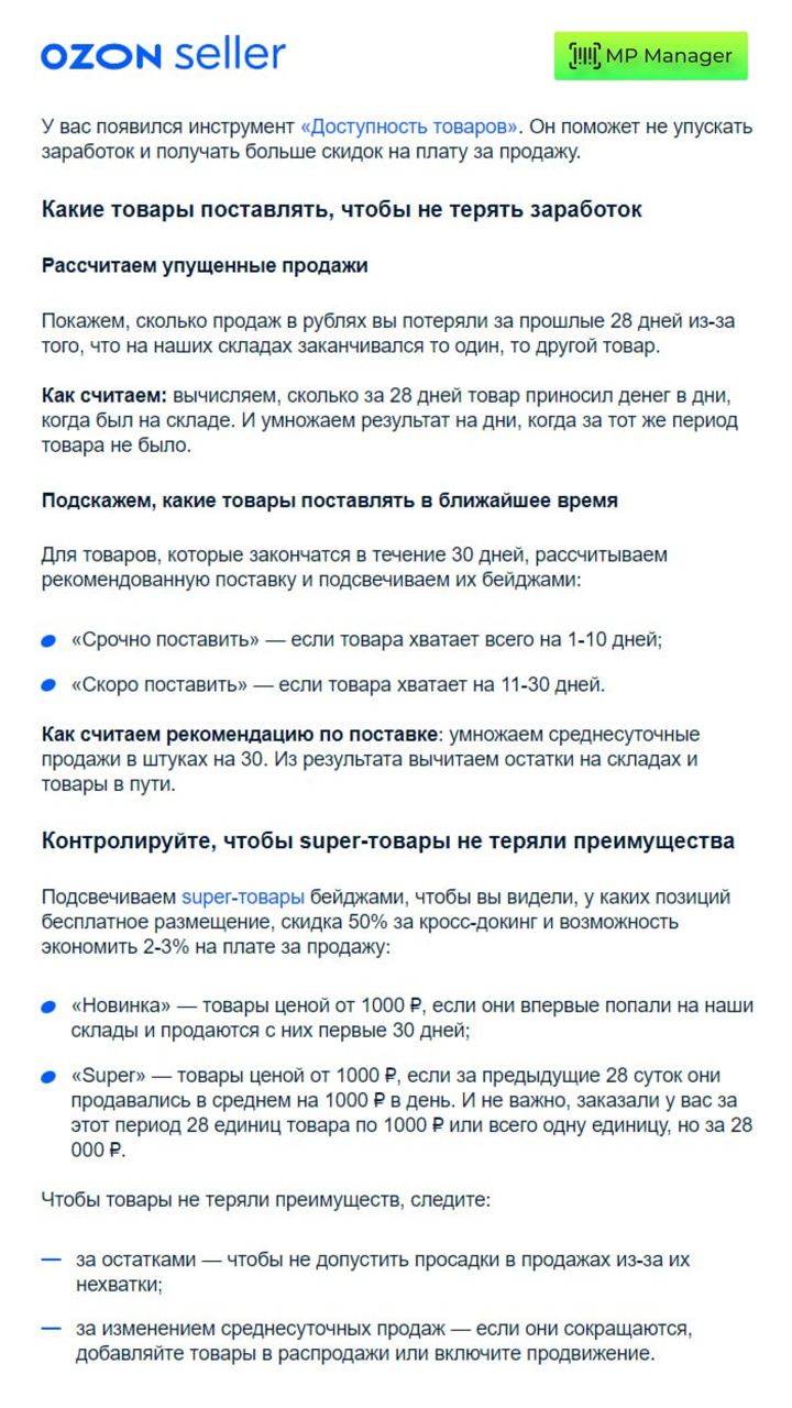 **У OZON появился инструмент «Доступность товаров»**📣 *Он поможет не упускать заработок и получать больше скидок на плату за продажу.