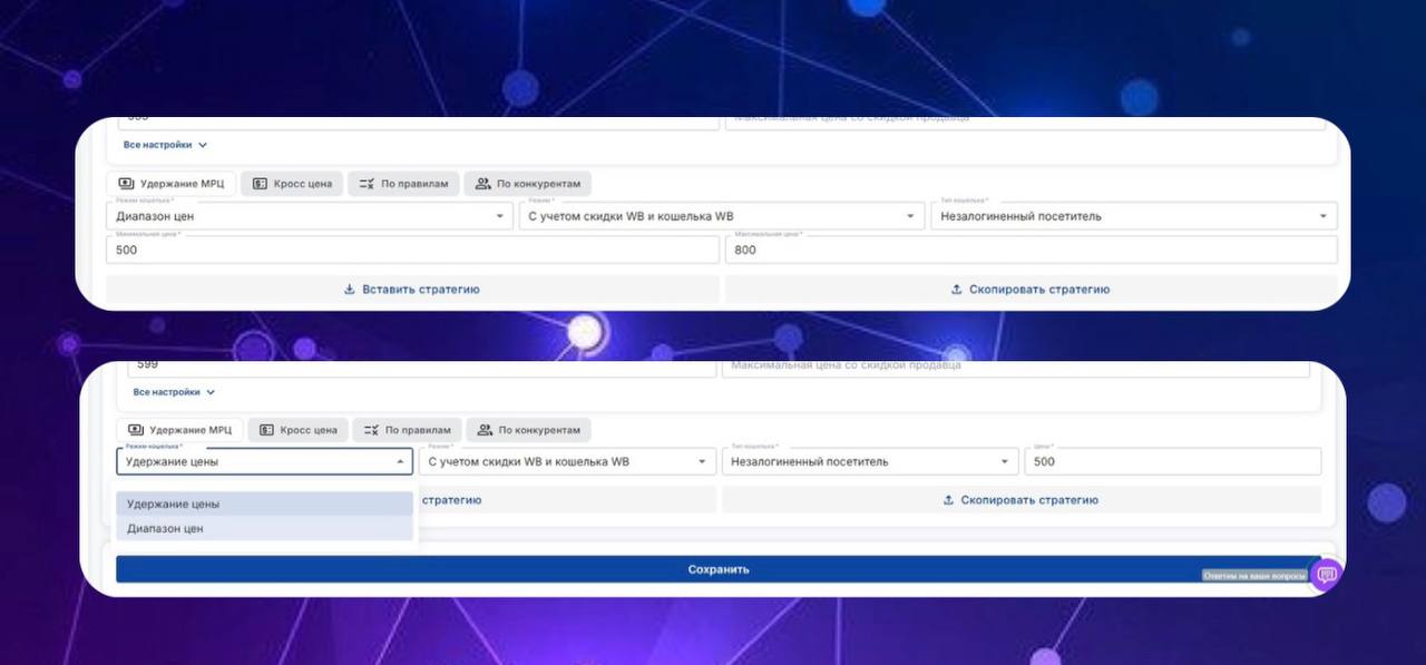 ✔️Настраиваемый интервал проверки цен — можно выставить проверку раз в 3 часа, чтобы не попадать под фильтры WB. ✔️ Новый формат удержания МРЦ — вместо жёсткой фиксации цены можно задать диапазон. Пока цена товара в этом диапазоне, она не будет меняться. ▫️ Минимум — ваша МРЦ ▫️ Максимум — допустимая цена выше ✔️ Функция работает и для WB, и для Ozon