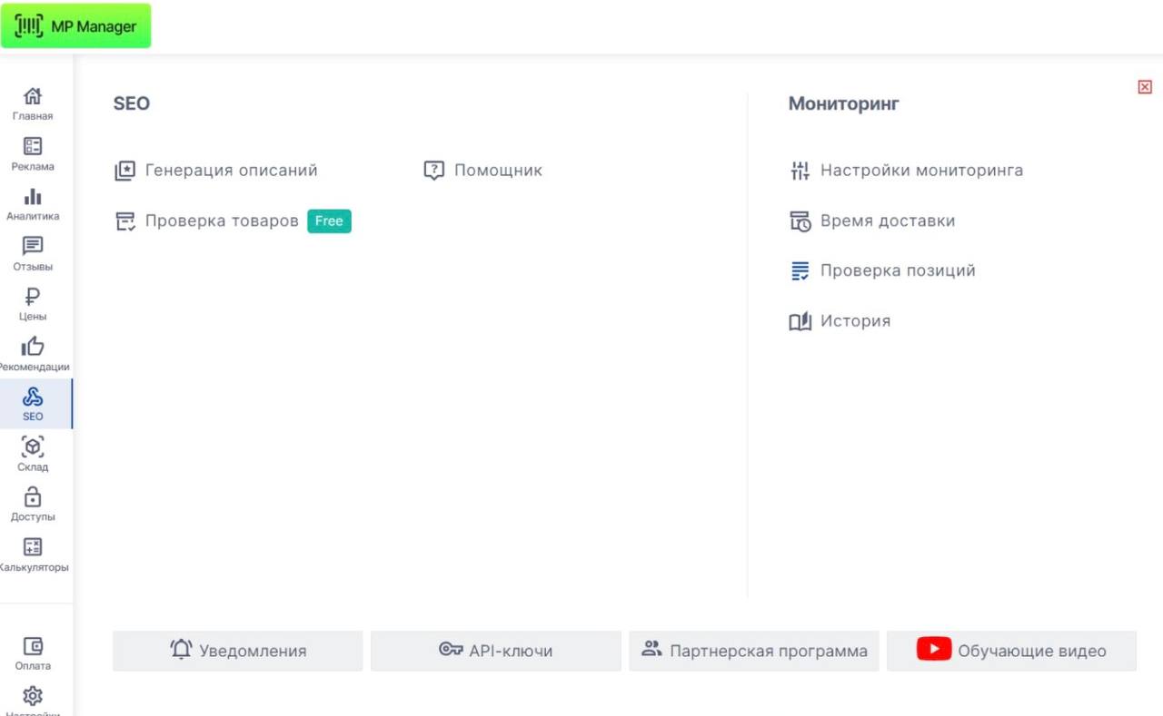 ✔️ Внешняя реклама, внутренняя реклама и аналитика рекламы находится в одном блоке** «Реклама»** ✔️ Мониторинг позиций находится в разделе** SEO** вместе с генератором описаний и другими полезными функциями
